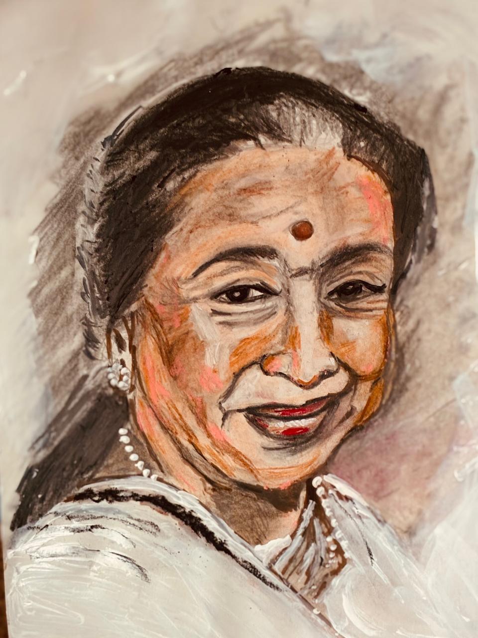 92 ವರ್ಷದ ಮತ್ತು ಪದ್ಮವಿಭೂಷಣ ಪ್ರಶಸ್ತಿ ಪುರಸ್ಕೃತರಾದ ಪ್ರಸಿದ್ಧ ಗಾಯಕಿ ಆಶಾ ಭೋಂಸ್ಲೆ ಅವರ ಭಾವಚಿತ್ರ ಇಲ್ಲಿದೆ. ಅವರು ಈ ವಯಸ್ಸಿನಲ್ಲೂ ಇನ್ನೂ ಸಕ್ರಿಯರಾಗಿದ್ದಾರೆ ಮತ್ತು ಸಂದರ್ಶನಗಳನ್ನು ನೀಡುತ್ತಿದ್ದಾರೆ